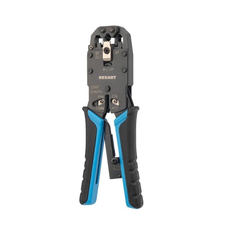 Кримпер REXANT HT-200R ТАЙВАНЬ — универсальный инструмент для обжима разъемов RJ-45 (8P8C и 10P10C), RJ-12 (6P6C), RJ-11 (6P4C и 6P2C) и RJ-10 (4P4C), а также для снятия изоляции и обрезки проводов.