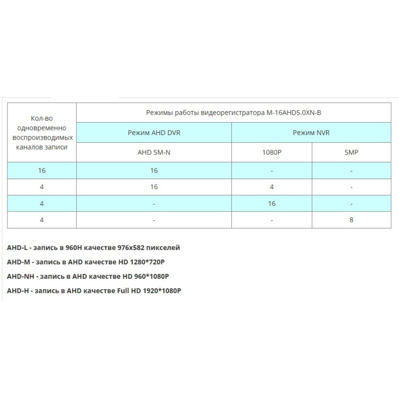 Разрешение записи на 16-ть каналов AНD 5M-N (1280*1920)*6 к/с, AНD-NH (960*1080)*16 к/с или IP разрешение до 5МP.