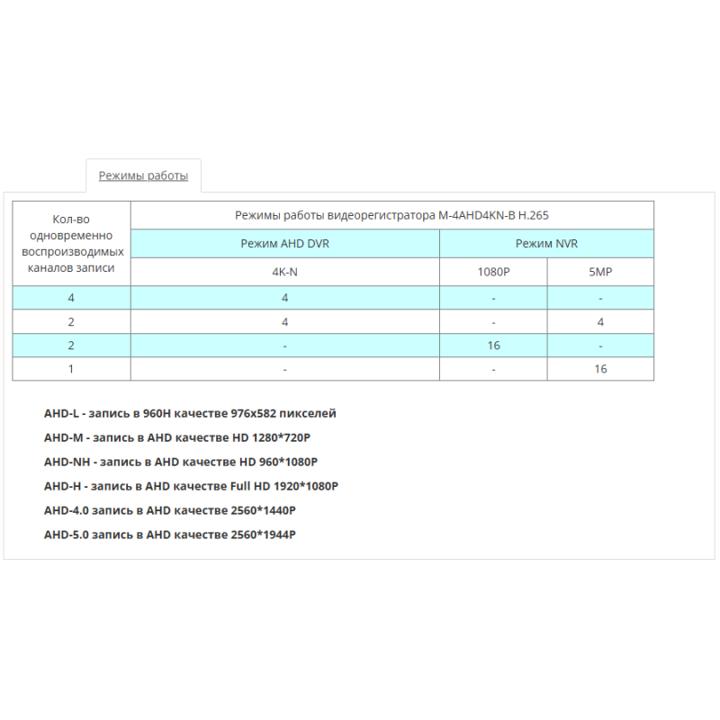 Разрешение записи на 4-е канала: 4K-N (1920*2160)*15 к/с, 5.0MP AHD (2560*1940)*12 к/с, AНD 5M-N (1280*1920)*25 к/с,, 4.0MP AHD (2560*1440)*16 к/с, 2.0MP AНD (Full HD 1920*1080)*25 к/с